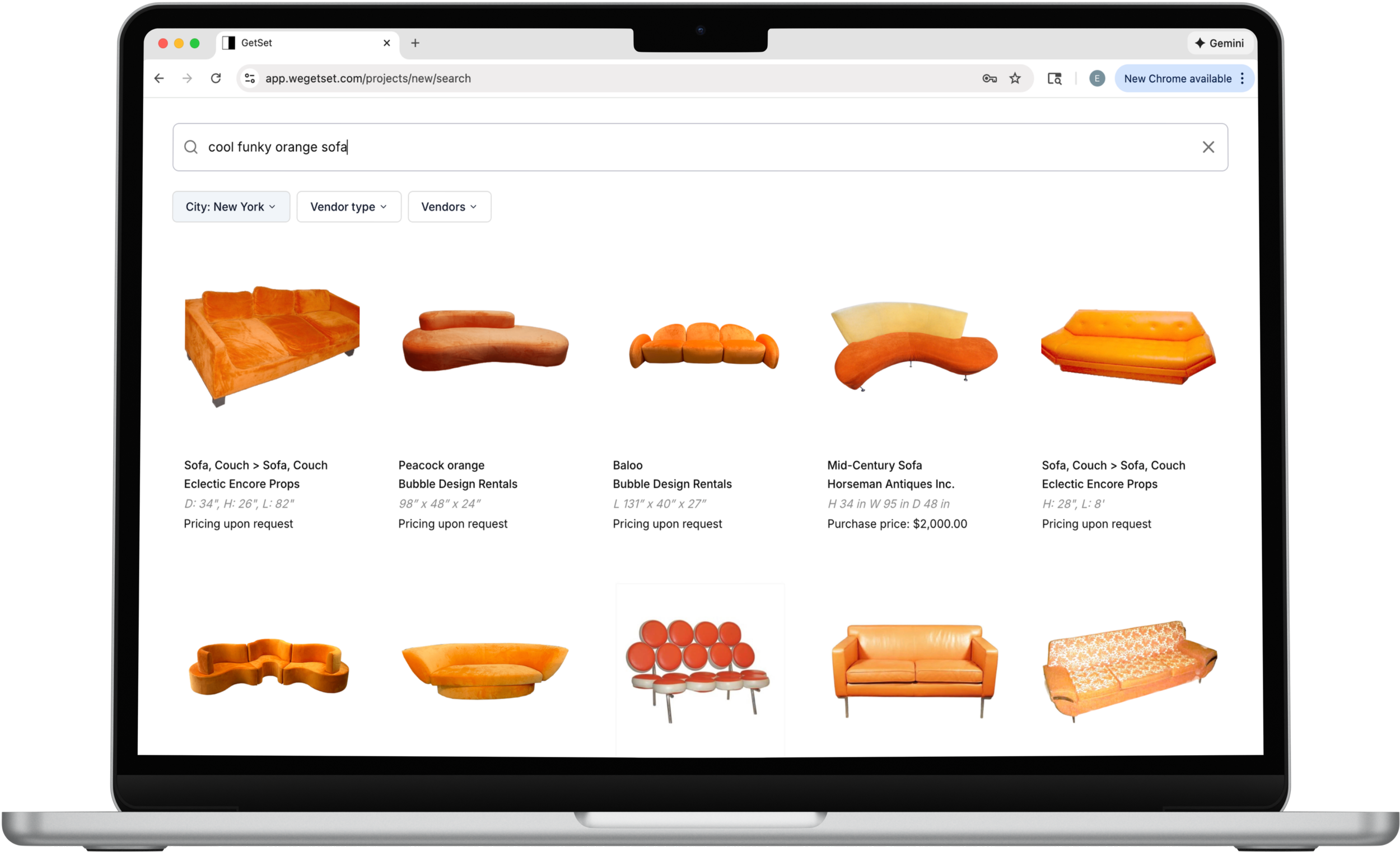 GetSet brings millions of rental listings onto a single website. Designed for professionals like production designers, set decorators, experiential designers, and event planners, GetSet transforms the rental experience.